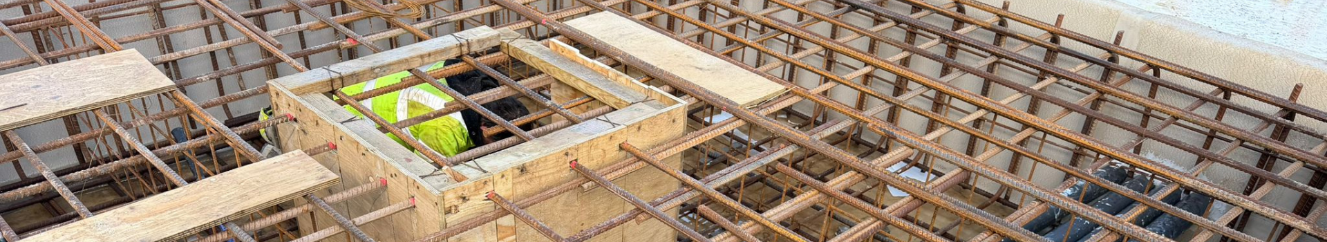 Strong progress continues across multiple workstreams on site. Binding pads are now complete to the main building, with ongoing installations around the PAC area and lower levels. Insulation and Sika waterproofing have commenced across both the construction and main buildings, while foundation cages and concrete works continue to advance.
